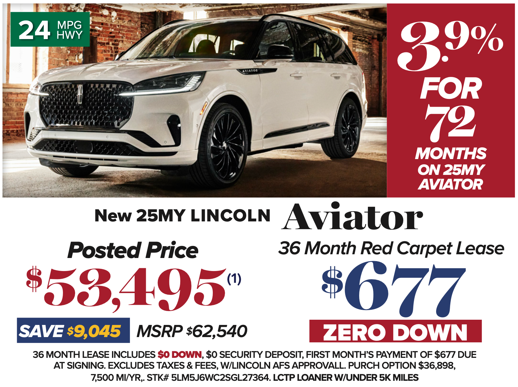 36 MONTH LEASE INCLUDES $0 DOWN, $0 SECURITY DEPOSIT, $677 FIRST MONTH’S PAYMENT DUE AT SIGNING, EXCLUDES TAXES & FEES, W/LINCOLN AFS APPROVAL. PURCH OPTION $36,898, 7,500 MI/YR,. MSRP: $62,540 STK# 5LM5J6WC2SGL27364.TO RECEIVE THE ADVERTISED PRICE, LCTP LOANER MUST MEET IN SERVICE MINIMUM REQUIREMENTS OF 3K MILES AND 90 DAYS. $15.60 PER $1000 FINANCED AT 3.9% FOR 72 MONTHS, WITH APPROVED CREDIT. ART FOR ILLUSTRATION ONLY, ALL PRICES + TT&L. OFFERS EXPIRE 3/31/26.