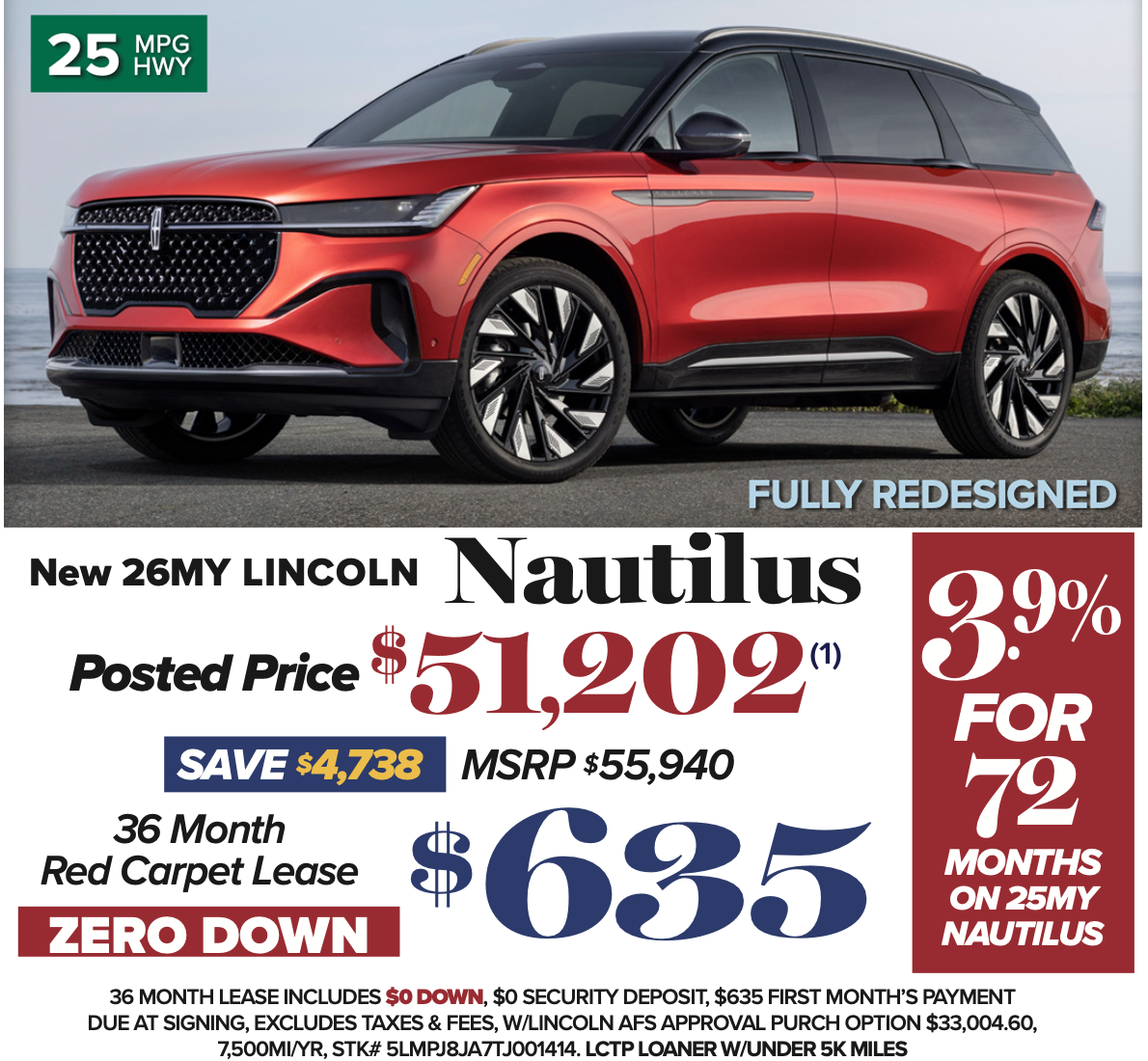 $55,940 MSRP, $635 Red Carpet Lease with $0 down pmt, $0 Security deposit, $635 first payment due at signing with approved Lincoln AFS financing, excludes taxes and fees. Purchase option $33,004.60, 7,500 mi/yr 36-month lease. VIN# 5LMPJ8JA7TJ001414 .LCTP Loaner w/under 5k Miles. To receive the advertised price, LCTP loaner must meet in service minimum requirement of 3k miles and 90 days. $15.60 per $1000 financed at 3.9% for 72 months, with approved credit. Offers expire 3/31/26. Model in photo has optional extra equipment.