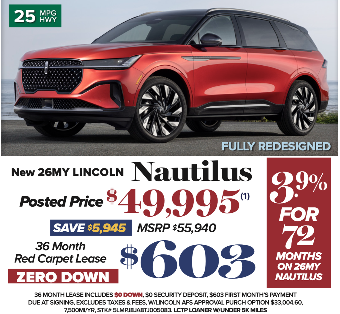 $55,940 MSRP, $603 Red Carpet Lease with $0 down pmt, $0 Security deposit, $603 first payment due at signing with approved Lincoln AFS financing, excludes taxes and fees. Purchase option $33,004.60, 7,500 mi/yr 36-month lease. VIN# 5LMPJ8JA8TJ005083 .LCTP Loaner w/under 5k Miles. To receive the advertised price, LCTP loaner must meet in service minimum requirement of 3k miles and 90 days. $15.60 per $1000 financed at 3.9% for 72 months, with approved credit. Offers expire 4/30/26. Model in photo has optional extra equipment.